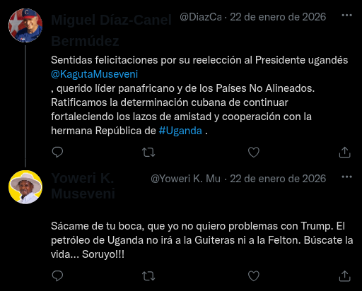 Todo comenzó cuando el mandatario cubano, conocido por su capacidad casi mágica de hablar de cualquier cosa sin decir nada concreto, publicó uno de esos tuits que empiezan en la solidaridad entre los pueblos, dan una vuelta por el antiimperialismo y terminan aterrizando en países que no pidieron ser invitados a la conversación. Esta vez, el destino fue Uganda.